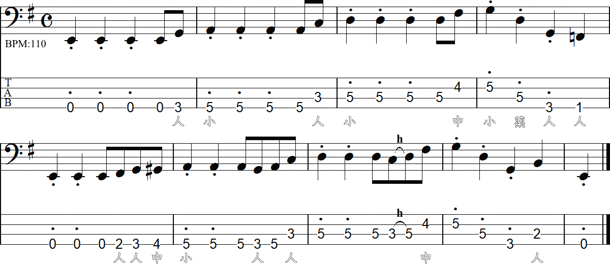 1小節目のように、サムピングする弦が直ぐに切り替わると、初心者にはかなり難しいです。また、サムピングする時に弦を見てしまいますが、弦を見ないでも手の感覚だけで、4弦と3弦をサムピング出来るようにしてください。暫くは1小節目を、繰り返し弾くのも良いでしょう。