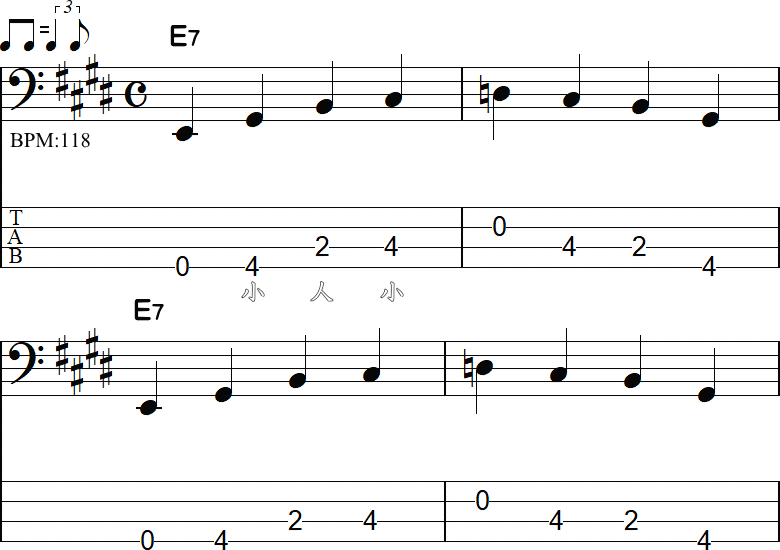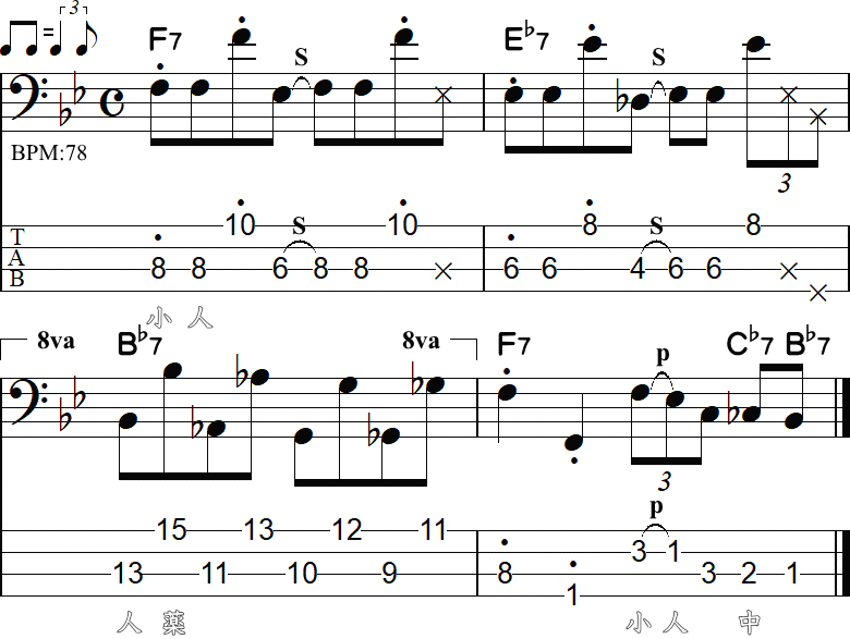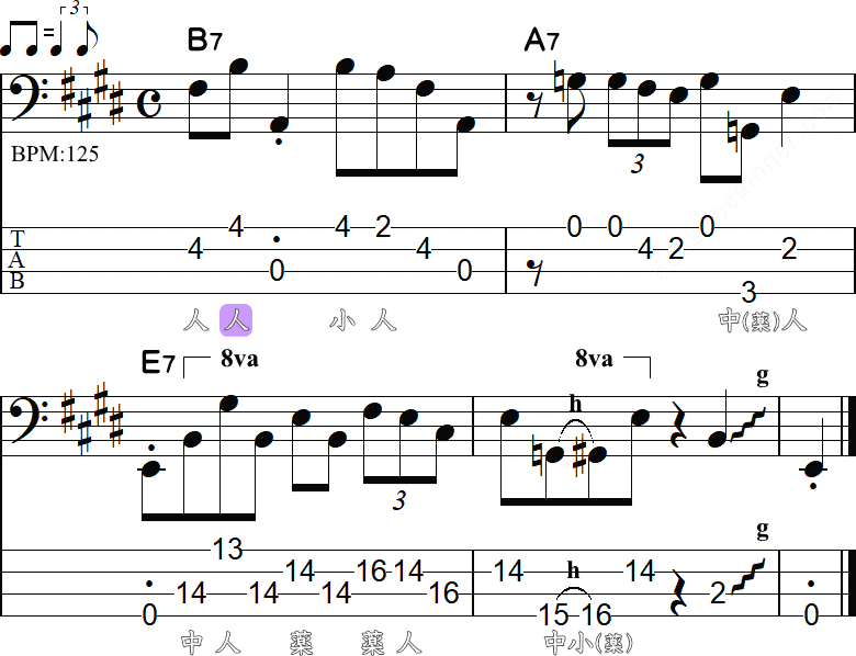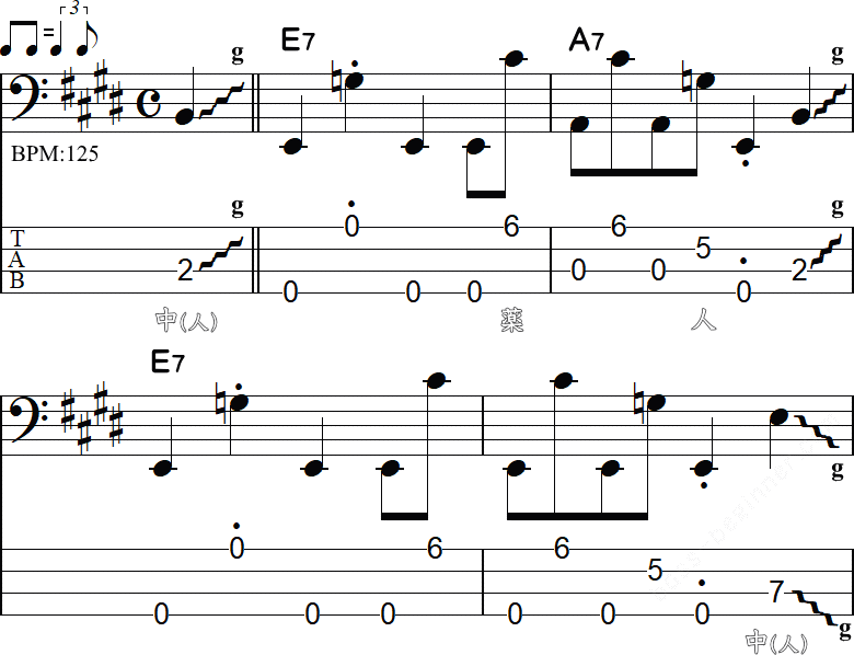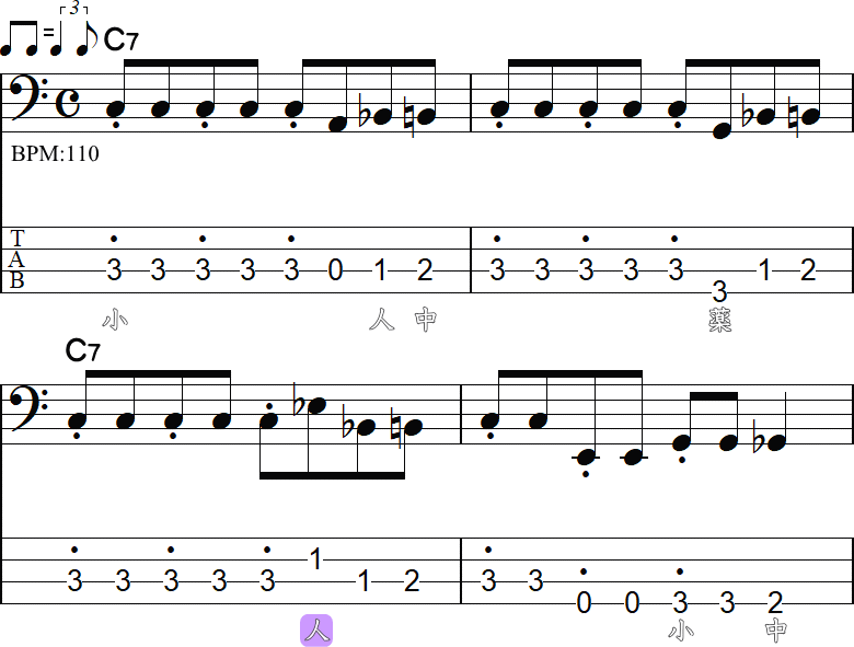 1・2弦はプラッキングしており、それでドラムのスネア感を出しています。バンドにドラムがいない時など、このようにしてやると、リズムが生まれるでしょう。