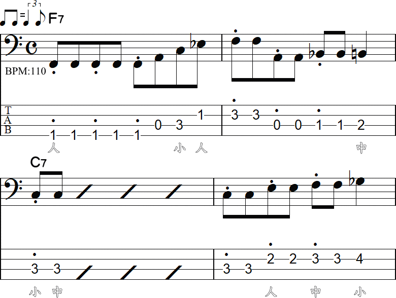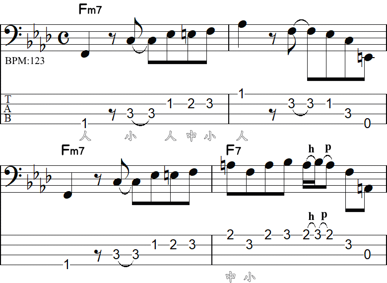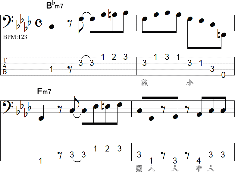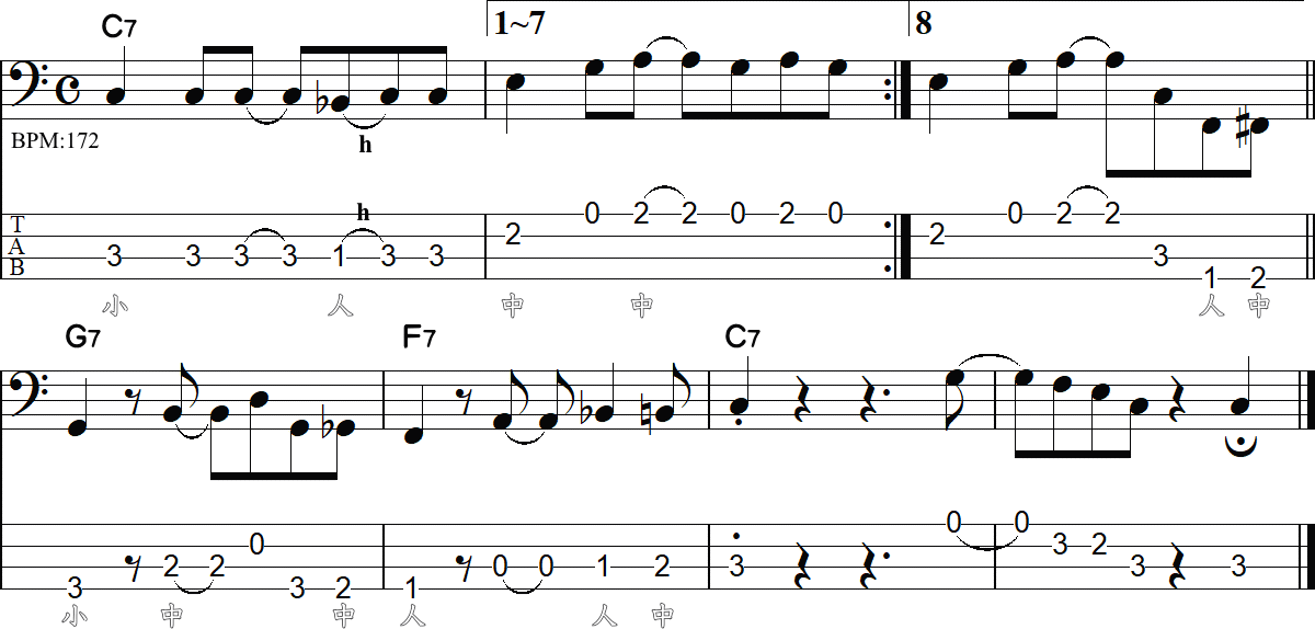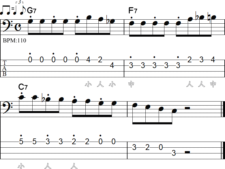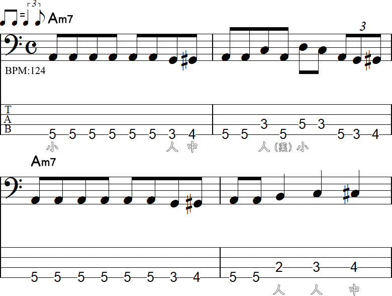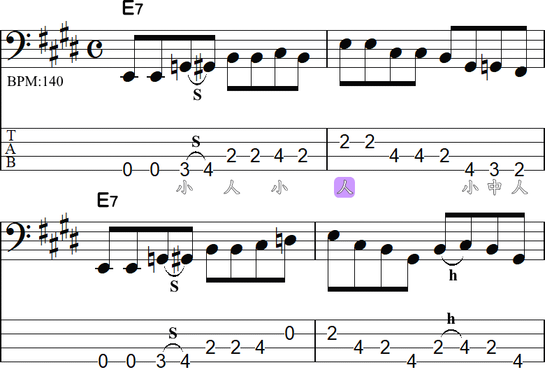 ポジション移動が少ないベースラインなら、親指はネックを握りしめる、ロックスタイルで弾き切る人もいます。自分の手の大きさに合わせて、運指を考えてみましょう。