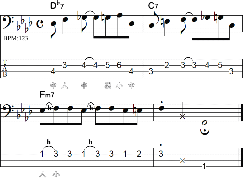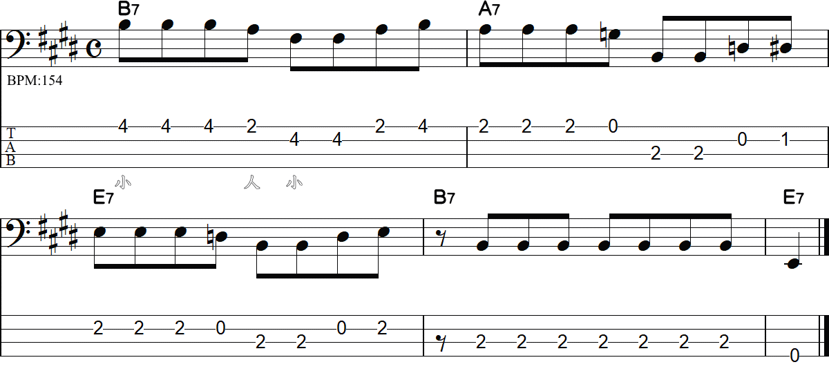 フォービート(4分音符)のみの、簡単なフレーズです。9小節目ですが、指が届かなければ、ポジション移動で押弦しましょう。