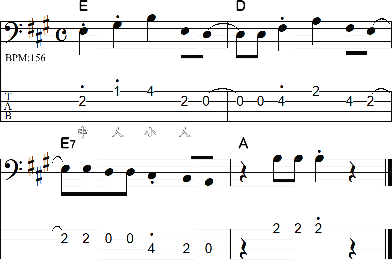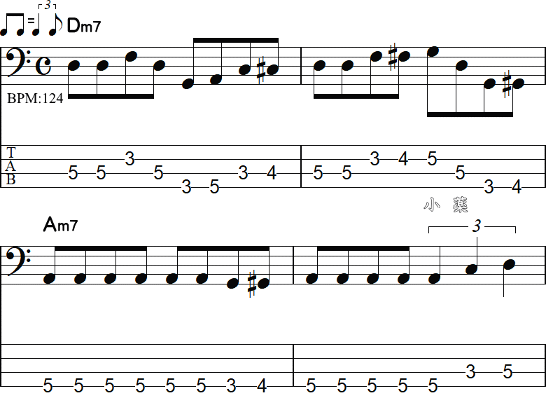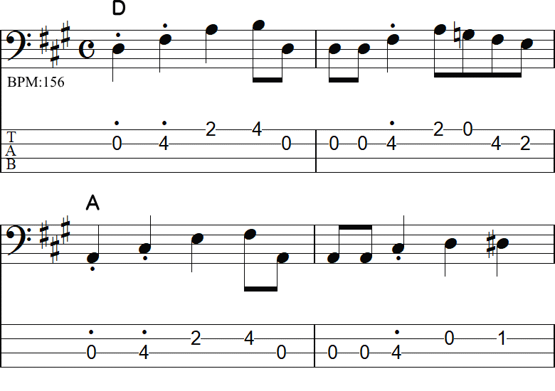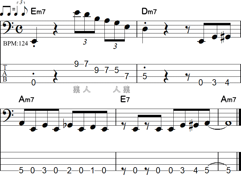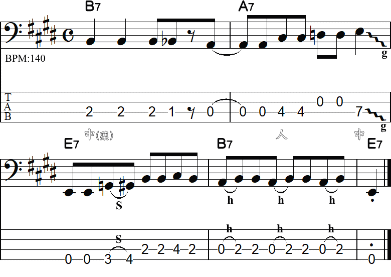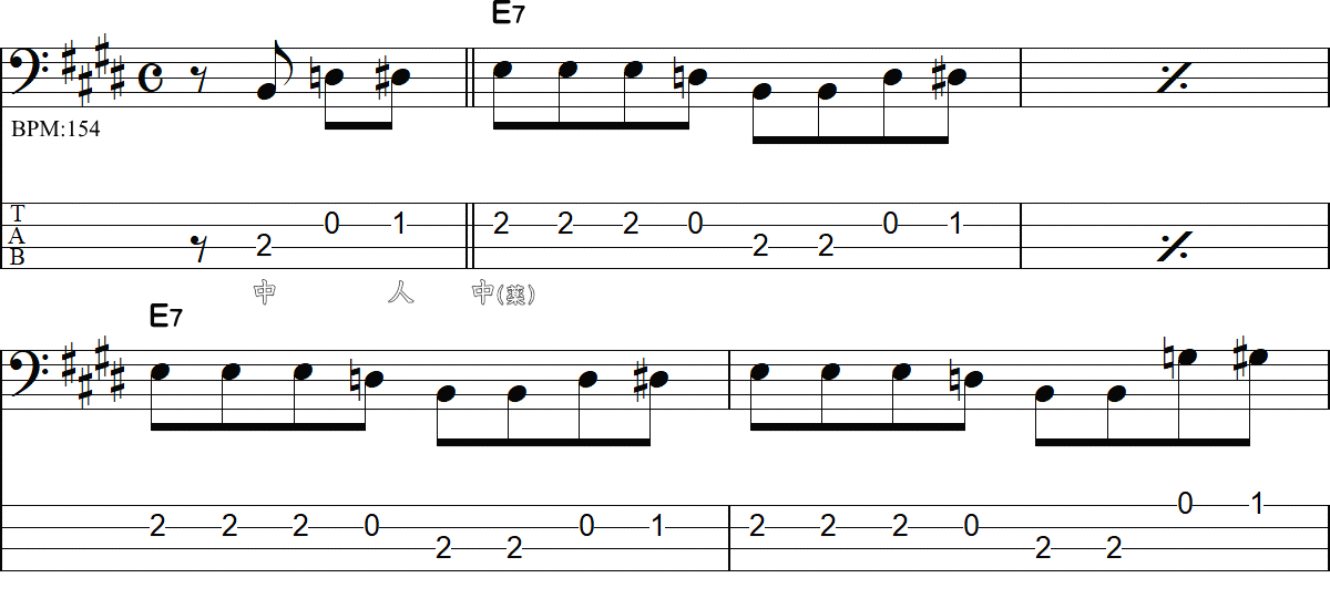 有名なギターフレーズを、ベースアレンジさせてみました。音源の通りでなくても良いので、ハモらせる部分と、ミュートする部分を明確にして、弾いてやりましょう。ここではピック弾きですが、指弾きやスラップで弾いても面白いです。しかし、かなり難しいフレーズなので、相当な時間が必要です。