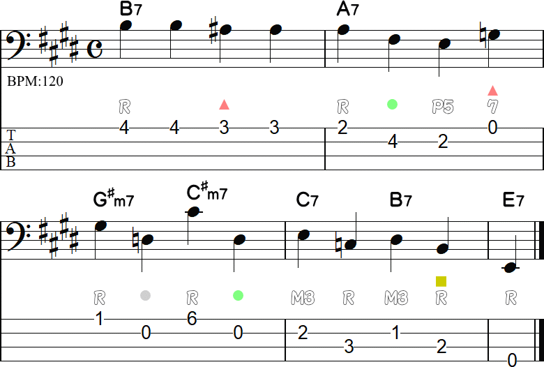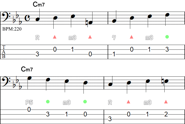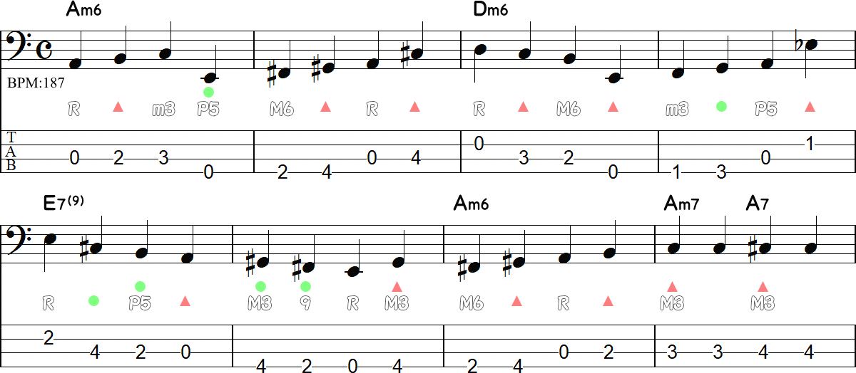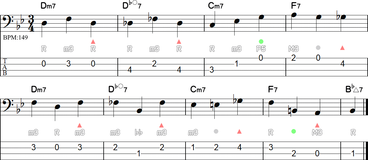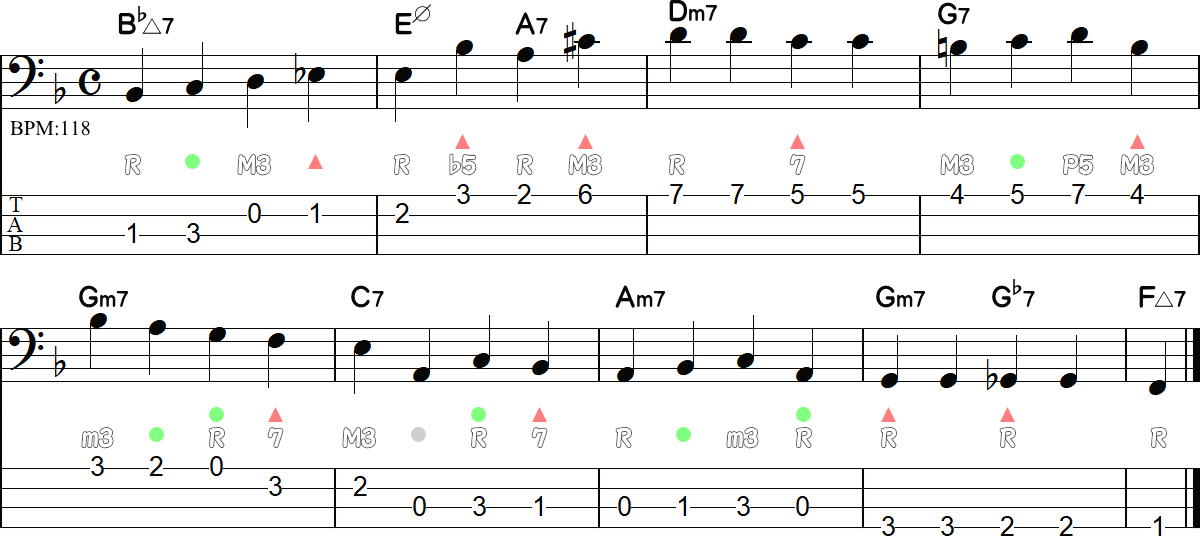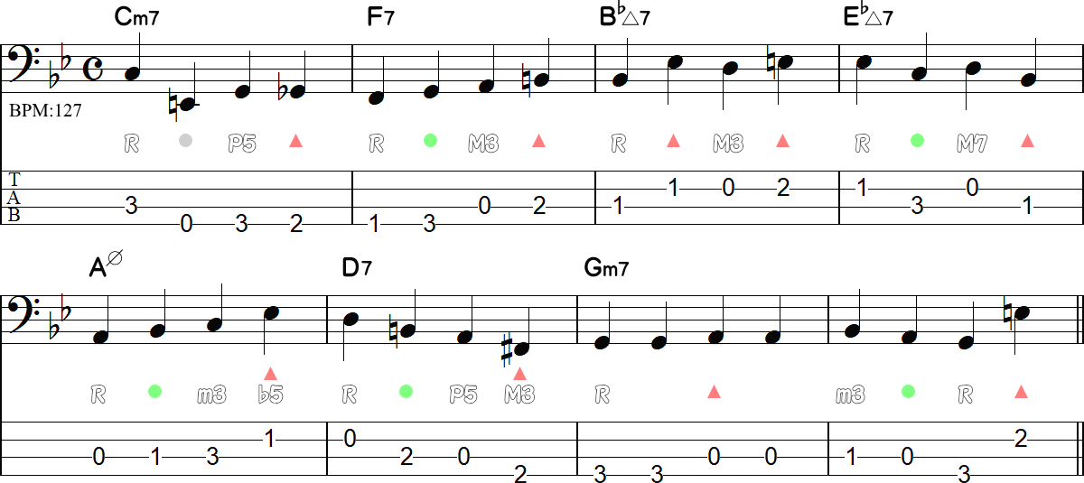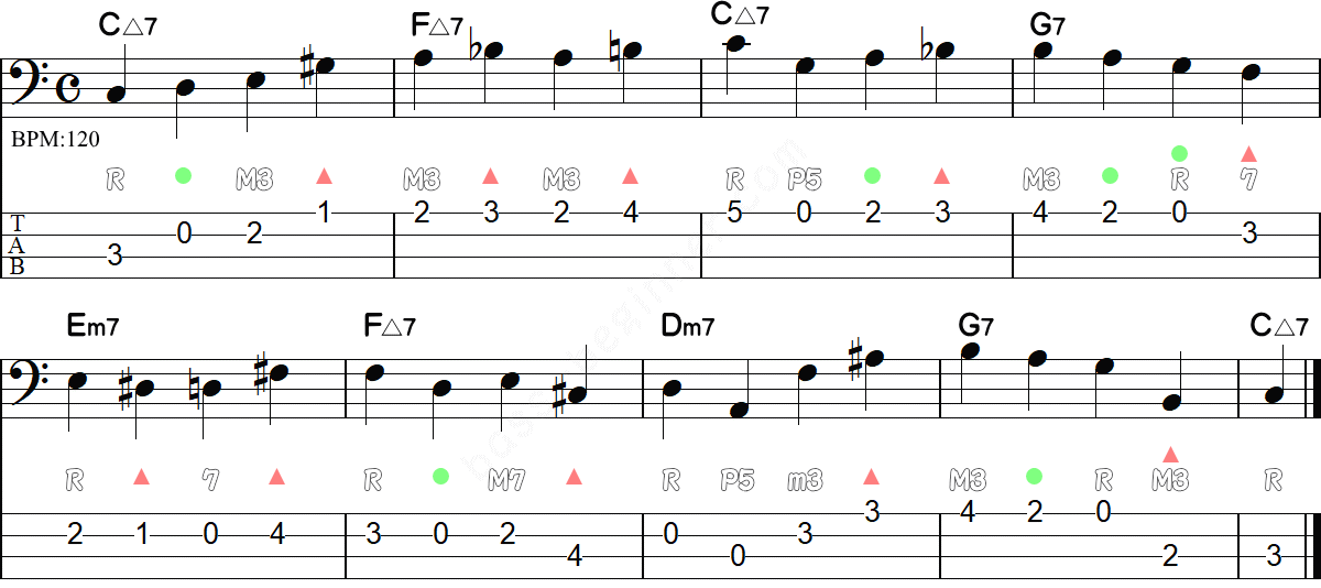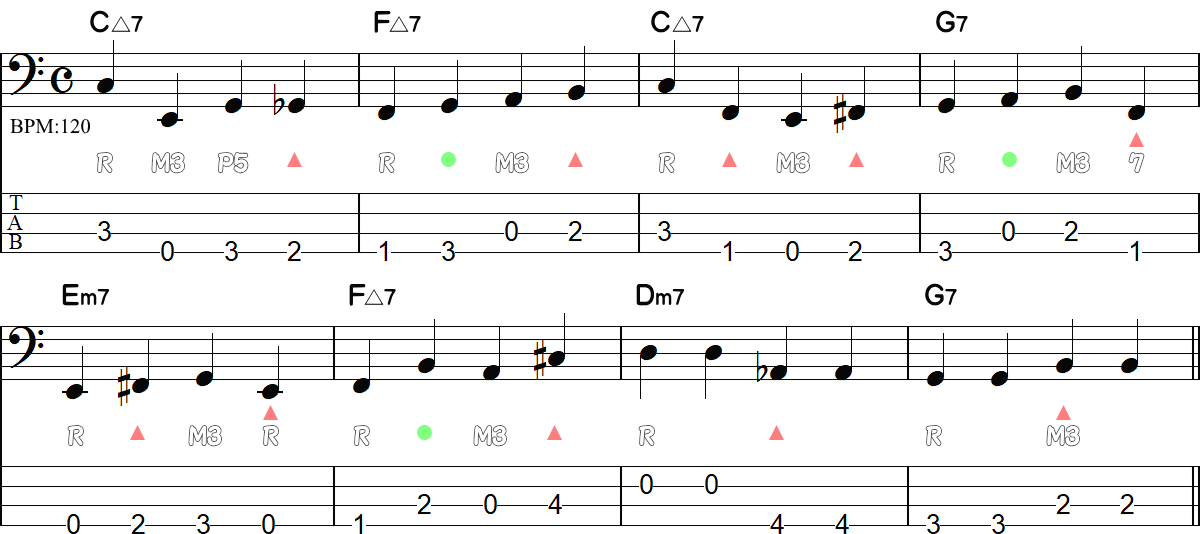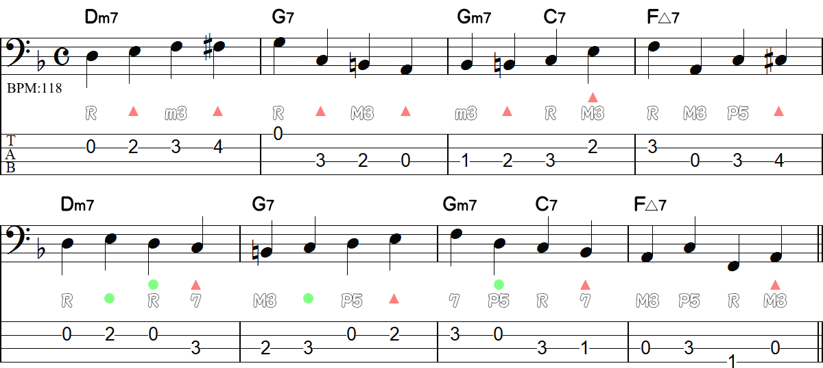ジャズでメインになるベースラインは、4分音符を中心に組み立てられる、ウォーキングベースです。ここでは1・3拍目にコードトーン、2・4拍目にアプローチノートという、ウォーキングベースの基本となる、組み立て方が中心ですが、それ以外になっても問題ないので、自分でも考えてみてください。