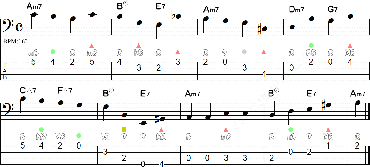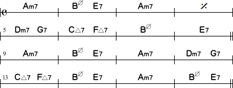 ジャズのスタンダード「Autumn Leaves」のコード進行は、ジャズの練習曲として最適です。上記は前半の16小節ですが、4度進行という易しいコード進行なので、ウォーキングラインも作り易いです。