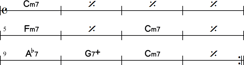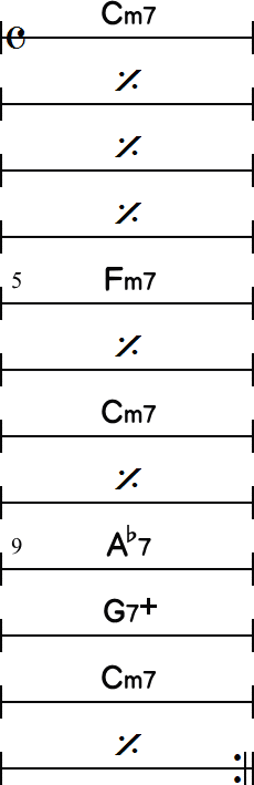 ジブシージャズの始祖である、ジャンゴ・ラインハルトの「minor swing」の、コード進行です。同じコード進行が続く場合、ルート以外のコードトーンから入る、という方法も覚えておきましょう。