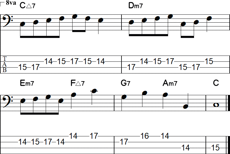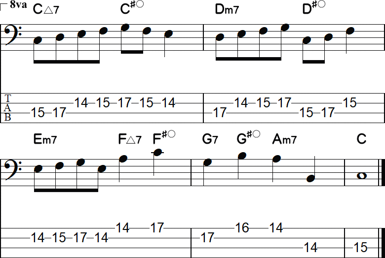❶のC△7からDm7と、Dm7からEm7は、全音の音程があります。その全音の間に、両方を半音で繋げるように、ディミニッシュセブンスを置いたのが❷です。このようなディミニッシュセブンスを、特にはパッシングディミニッシュ(pd)と言い、コード間の流れをスムースにします。