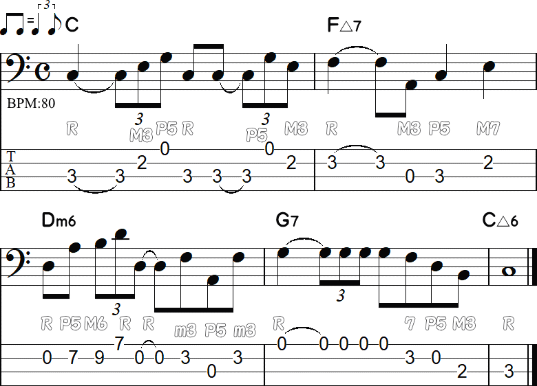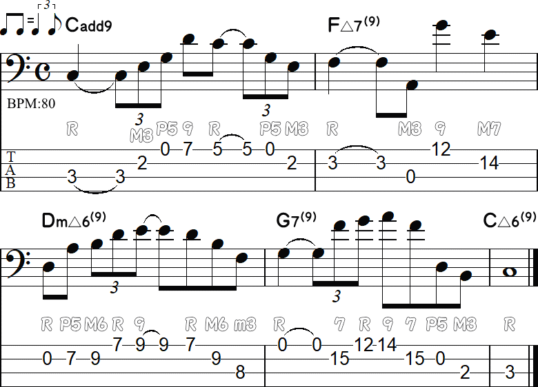 今度も同じく❸と❹とで、テンションの無有があります。リズム等は先程と同じなので、ベースラインをつけてみましょう。ただ❹になったとしても、無理にテンションを使う事はありません。ソロになれば別ですが、ベースラインのテンションは、ピアニストやギタリストに、任せてしまうのも良いです。