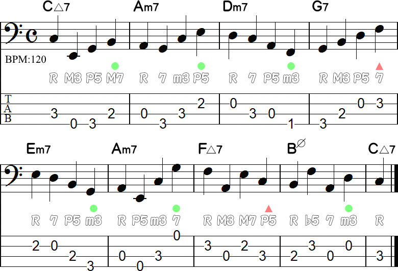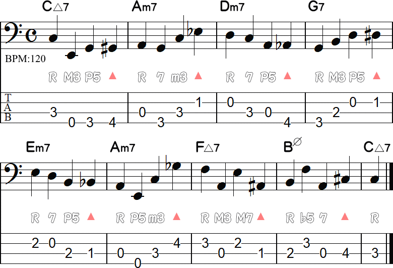 アルペジオというのは、コードを構成する音の、コードトーンと同じ意味です。ただ、同じ音を使うのではなく、一音ずつ違う音を弾き、ウォーキングラインを作るのが、ここでいうアルペジオです。コードのポジションが頭に入っていれば、気軽に使えるウォーキングベースになるでしょう。