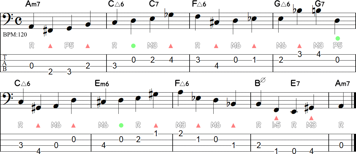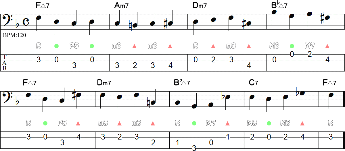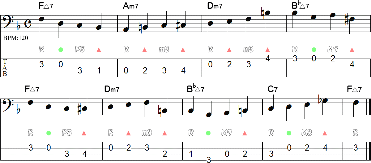 - 強拍にコードトーンを置くと、ウォーキングラインが安定する。