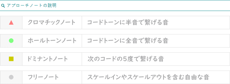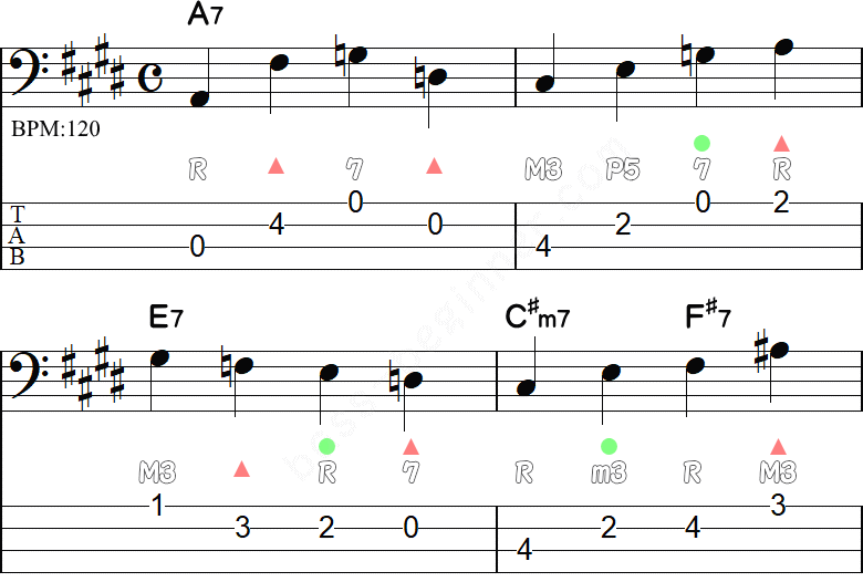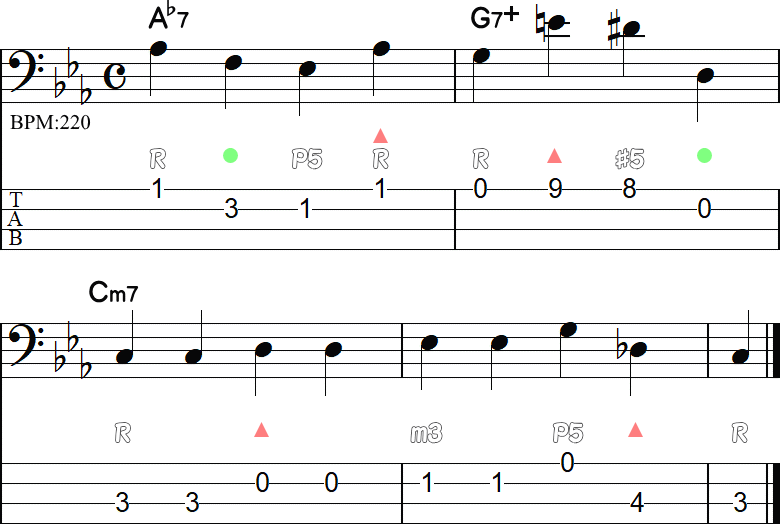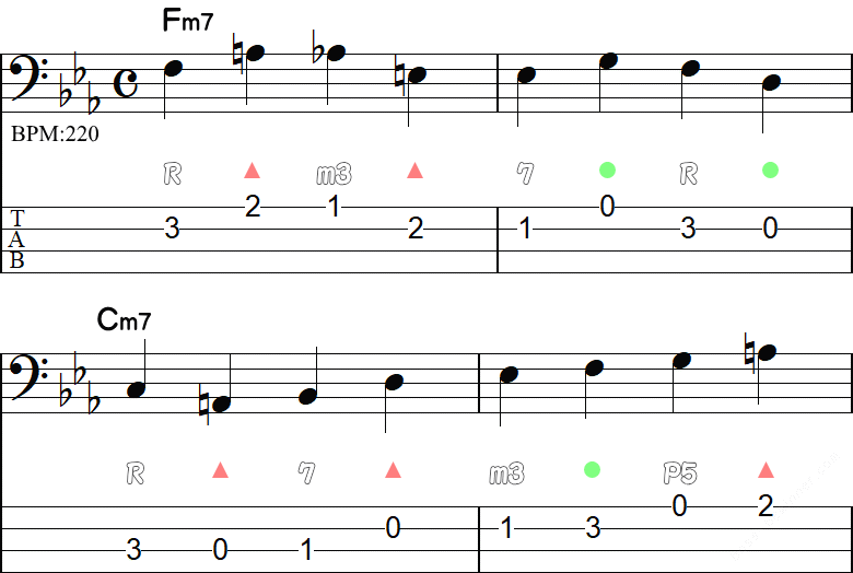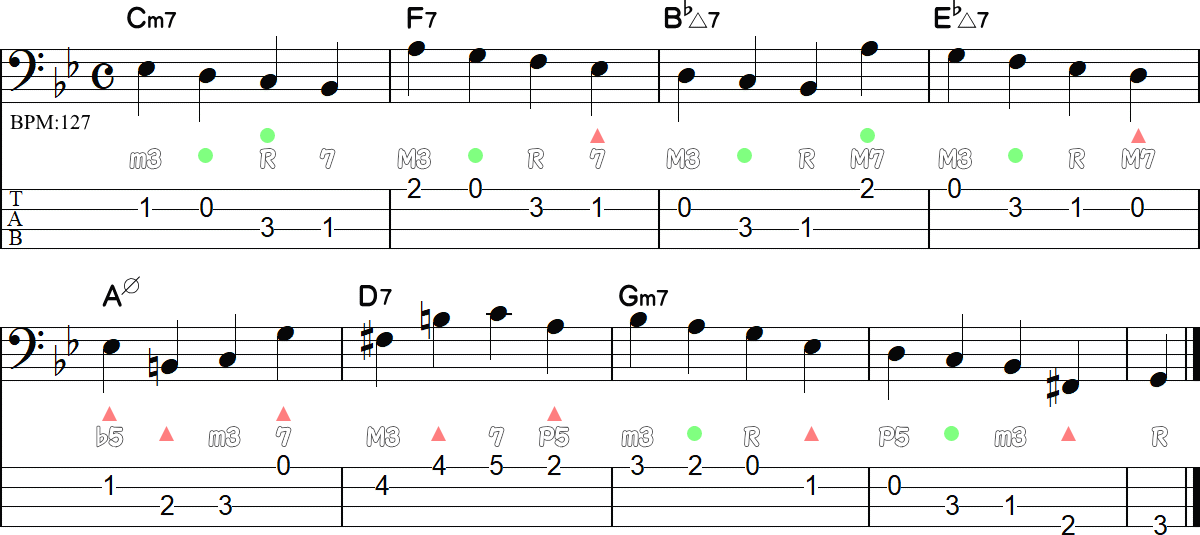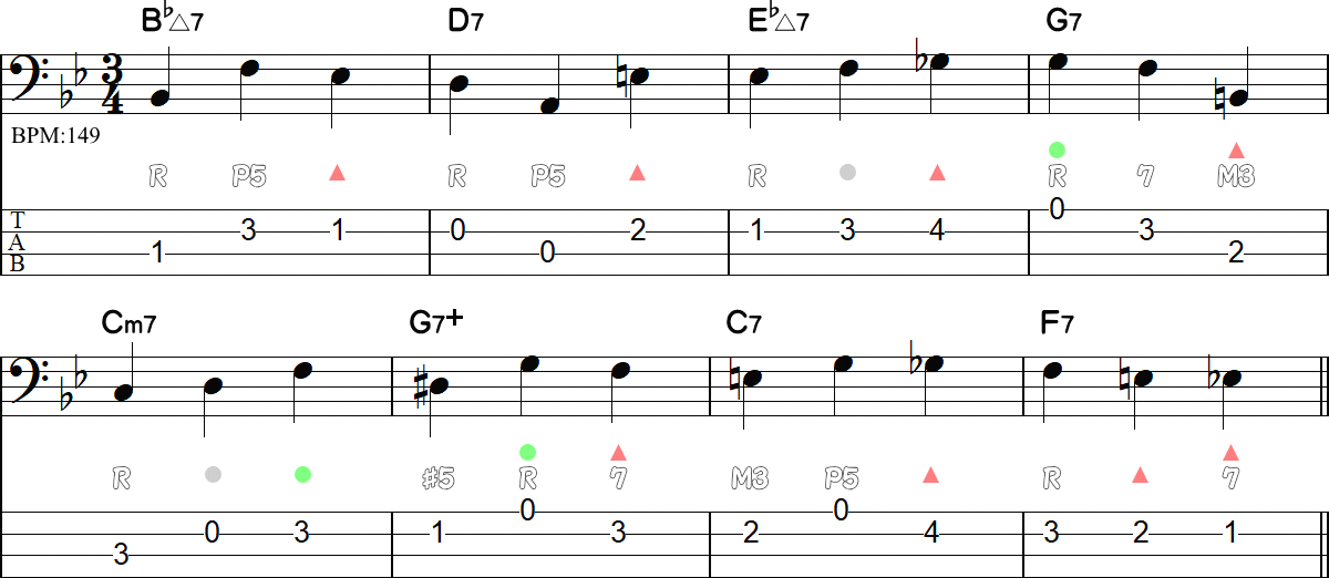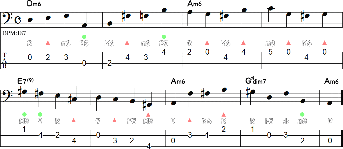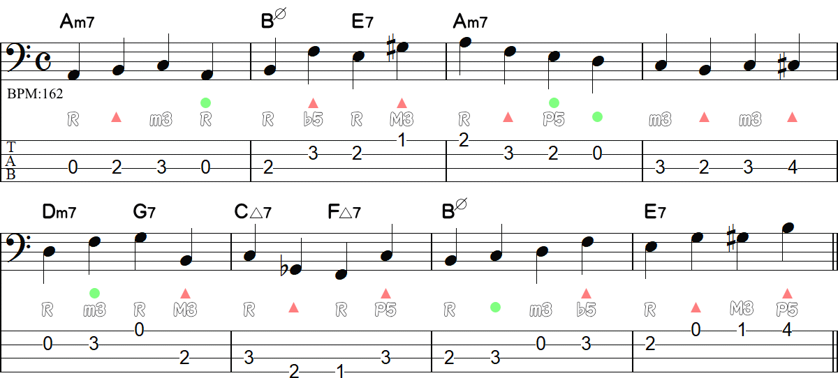 ジャズでメインになるベースラインは、4分音符を中心に組み立てられる、ウォーキングベースです。ここでは1・3拍目にコードトーン、2・4拍目にアプローチノートという、ウォーキングベースの基本となる、組み立て方が中心ですが、それ以外になっても問題ないので、自分でも考えてみてください。