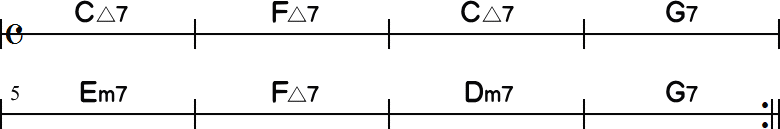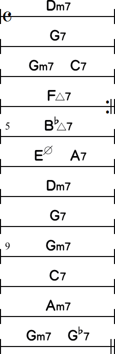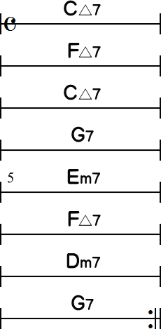 ジャズのスタンダード「Summer Time」のコード進行です。上記はほぼ原曲のままですが、ジャズではコード進行も、演奏者によりアレンジされる事が多いです。