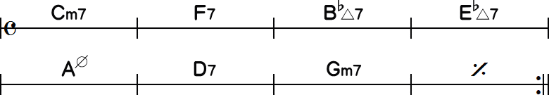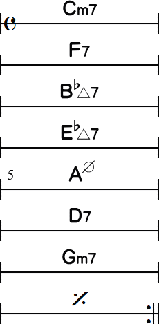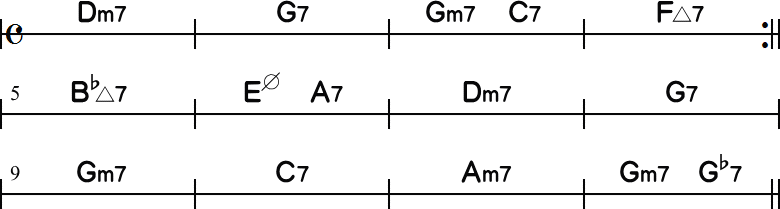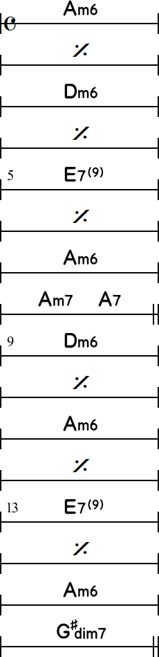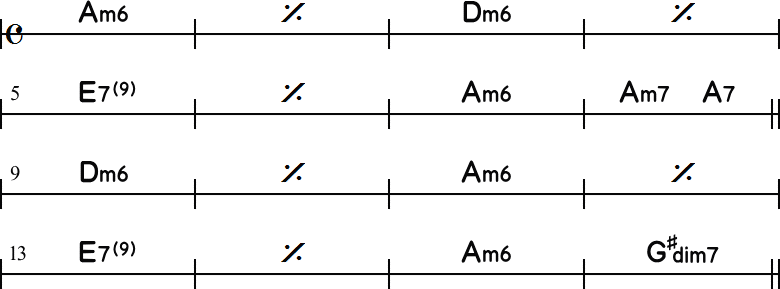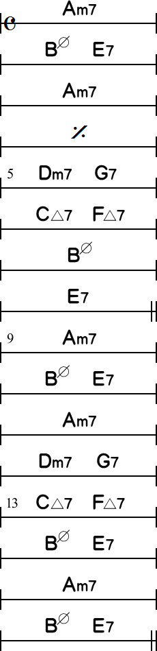 ジブシージャズの始祖である、ジャンゴ・ラインハルトの「minor swing」の、コード進行です。同じコード進行が続く場合、ルート以外のコードトーンから入る、という方法も覚えておきましょう。