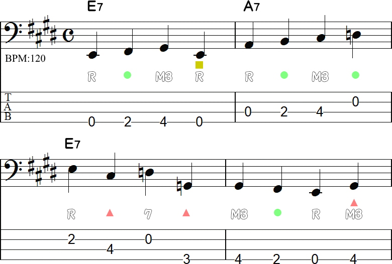 ポップス等でもよく使われる、シンプルなコード進行の、ウォーキングラインです。上記のコード譜も利用して、オリジナルのウォーキングライン、も作ってみてください。
