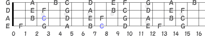 指板には同じ音名があり、それはオクターブであったり、異弦同音であったりします。上記もC同士は異弦同音、CとCはオクターブ、C同士は異弦同音と、最初はややこしく思えるでしょう。しかし、音を鳴らせば直ぐに分かり、オクターブと異弦同音の違いも、簡単な事だと分かります。