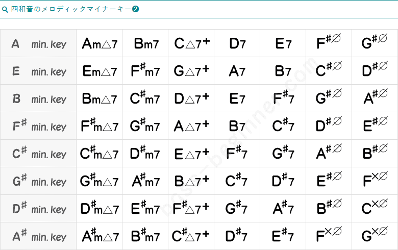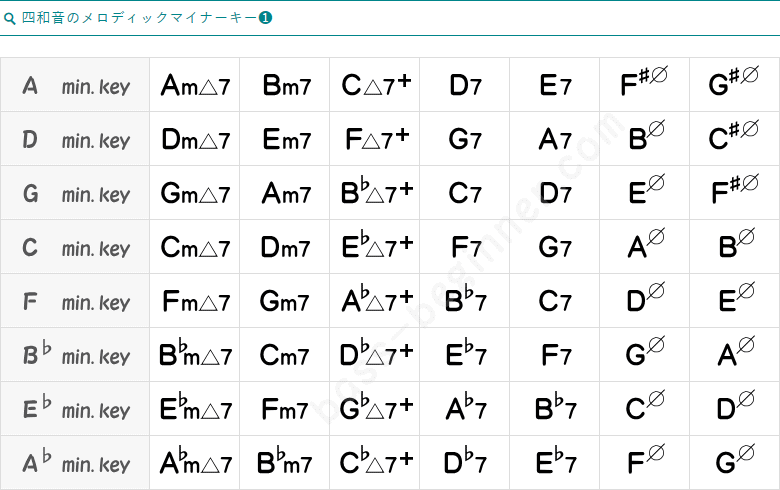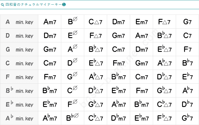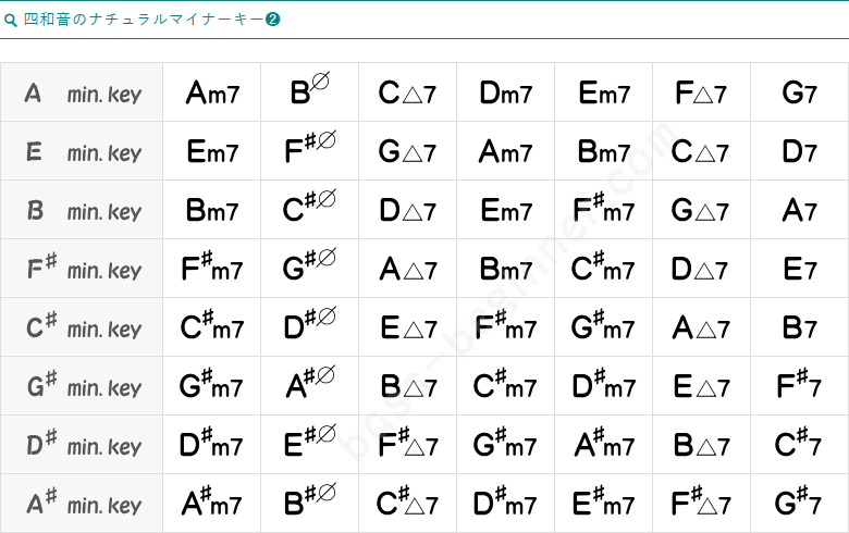 ナチュラルマイナースケールから作られるコードは、基本のマイナーコードと、考えておいてもよいでしょう。他キーのナチュラルマイナーキーのコードも、チラっと確認しておきましょう。