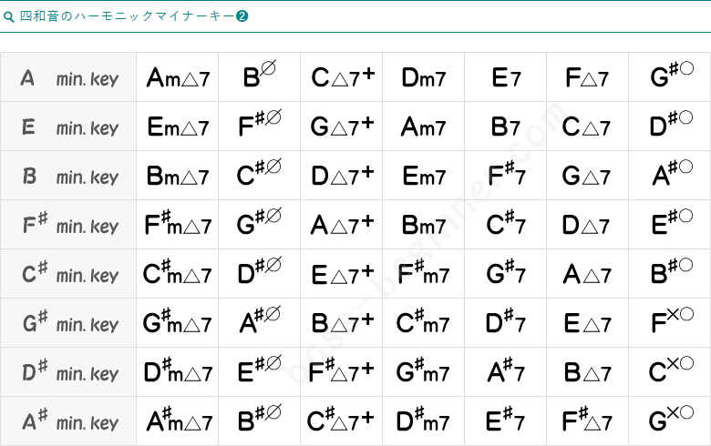 Aハーモニックマイナーキーに見られた、G#dim7ですが、他にも上表のような書き方をしますが、表記に7がない時は、三和音の可能性もあります。しかし、ジャズを中心とする音楽では、7がなくても四和音として、扱うのが通常なので、最初はややこしく思えます。